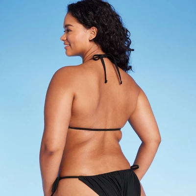 Crochet triangle bikini top from Wild Fable™ in a solid hue. Made from soft fabric with spandex and full lining for stretchy comfort in and out of the water. Removable cups offer customizable coverage. Front tie with tassels adds a chic accent. Adjustable straps and behind-neck tie closure provide the perfect stay-put fit.