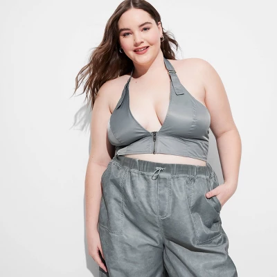 Halter tank top from Wild Fable™ in light teal blue with a hook-and-loop strap. Designed with a flattering deep V-neckline and front quarter-length zipper fastening. Tailored in a fitted silhouette with a smocked back panel and a cropped length. Made from lightweight recycled nylon for comfortable all-day wear.