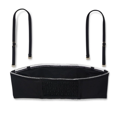 Bandeau bikini top from Wild Fable™ with picot bow trim. Made from recycled polyester tricot fabric with spandex and full lining. Opaque construction with boning. Removable cups offer customizable coverage, while adjustable straps make it easy to find the perfect fit.