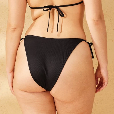 Low-rise, super-cheeky bikini from Wild Fable™ with ribbed texture in solid color. Made from recycled polyester knit material with spandex and recycled polyester lining. Adjustable side ties offer customizable wear. Ultra-high-leg cut finishes the chic look.